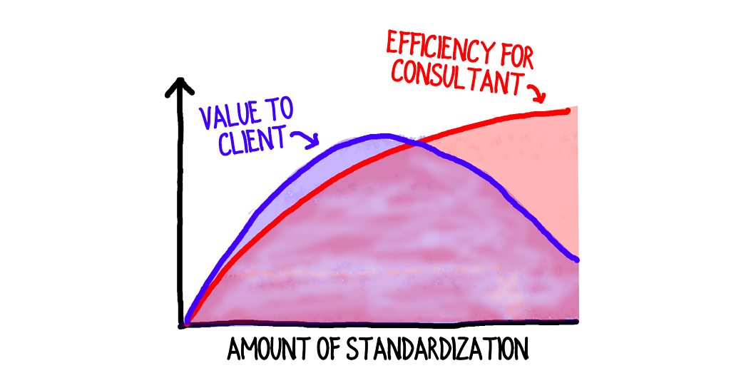 The most value for the client occurs when there’s enough standardization to capture best practices, but not so much as to ignore current circumstances. Maybe that’s a blog post in itself.